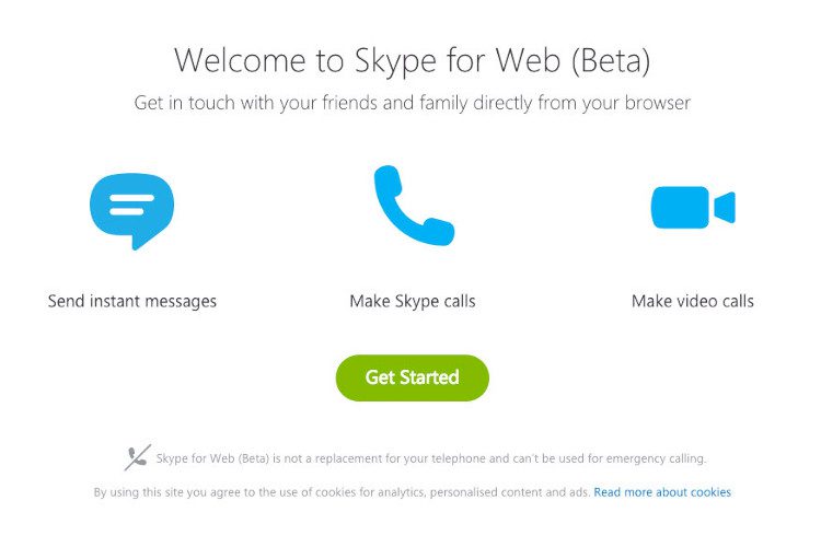برنامه Skype for Web از مرورگرهای اینترنت اکسپلورر، کروم، سافاری و فایرفاکس پشتیبانی میکرد، اما روی کرومبوکها قابل استفاده نبود. تنها کافی بود برای استفاده از تماس صوتی و تصویری یک افزونه روی مرورگر خود نصب کنید. این نسخه برای افرادی که از کامپیوترهای عمومی استفاده میکردند یا نمیخواستند نرمافزار اسکایپ را نصب کنند، گزینهای مناسب بود.