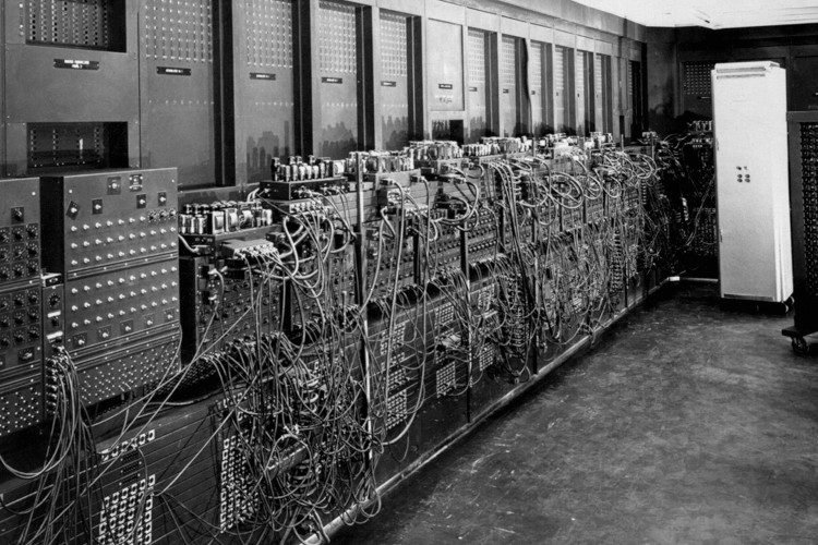 ENIAC اولین کامپیوتر الکترونیکی عمومی بود که در سال ۱۹۴۵ ساخته شد. این ماشین عظیم از ۱۷۴۶۸ لامپ خلأ برای پردازش استفاده میکرد، اما برنامههایش باید بهصورت دستی سیمکشی میشدند.